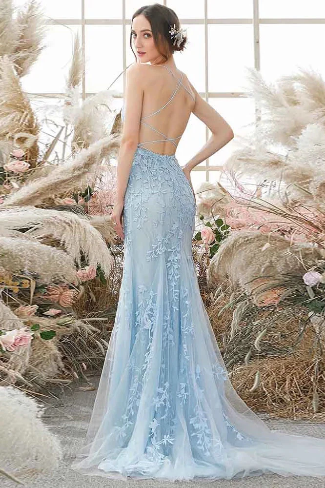 Charming V Neck Lace Sky Blue A-line Spaghetti Straps Prom Dress with Appliques OKW88