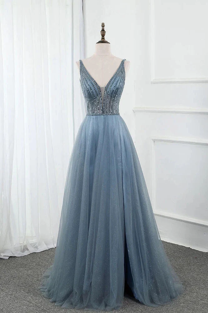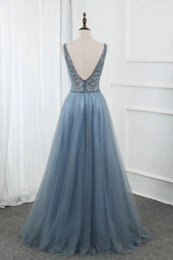 Sweet Blue Long V Neck Tulle Beading Backless Split Formal Prom Gowns OKW65
