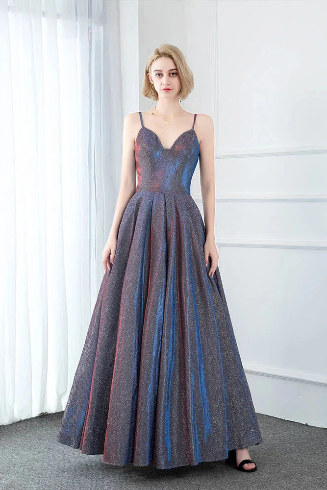 Shiny V Neck Purple Long Prom Dress Spaghetti Straps Long Formal Evening Dress OKX17