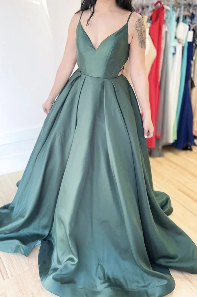 Simple A-line V Neck Green Satin Long Prom Dress Spaghetti Straps Formal Evening Dress OKX14