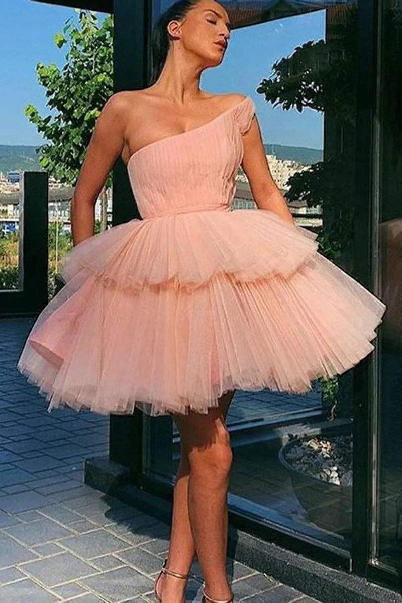 Pink Tulle One Shoulder Short Prom Dress A-line Homecoming Dress OKX67