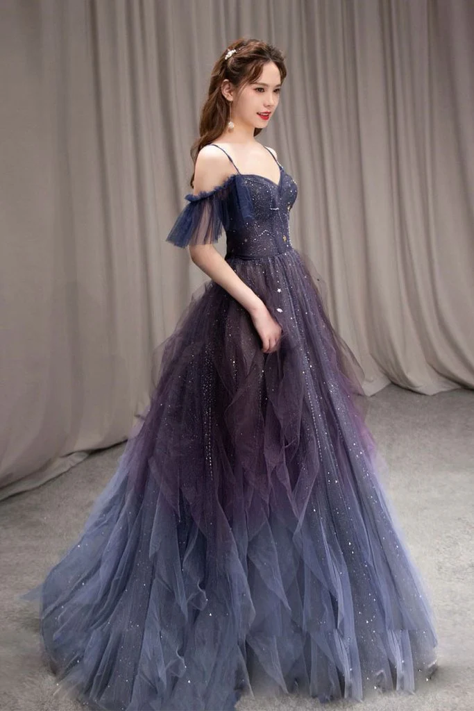 Dark Purple Sweetheart Neck Tulle Long Prom Dress A-line Ruffles Formal Dress OK1162