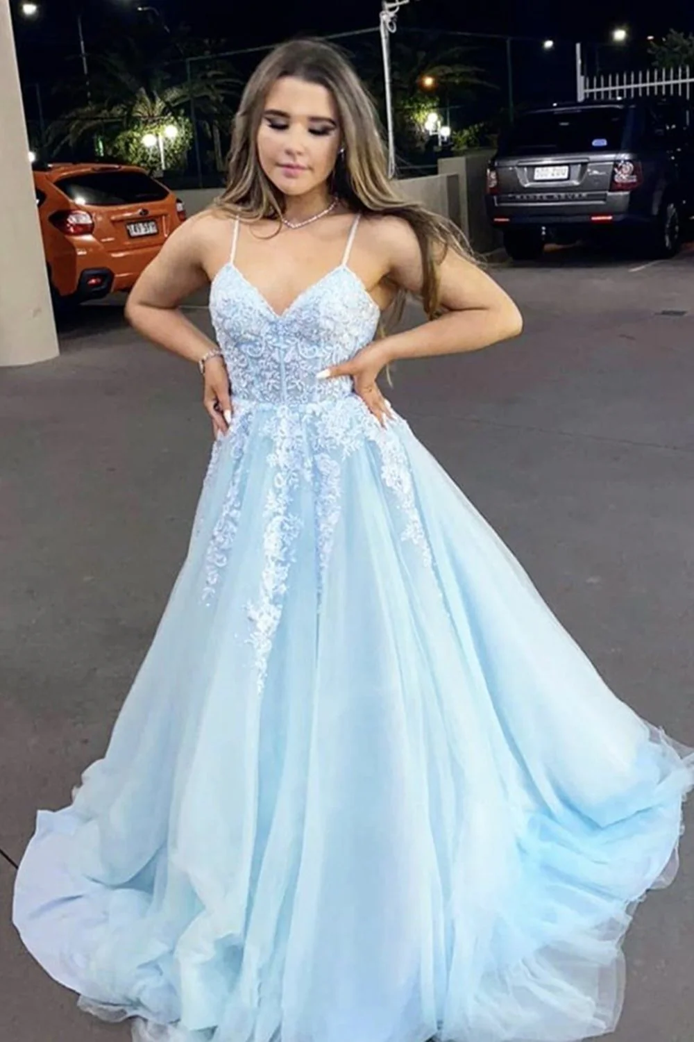 A-line V Neck Light Blue Lace Appliques Long Prom Dress Spaghetti Straps Formal Evening Dress OKY11