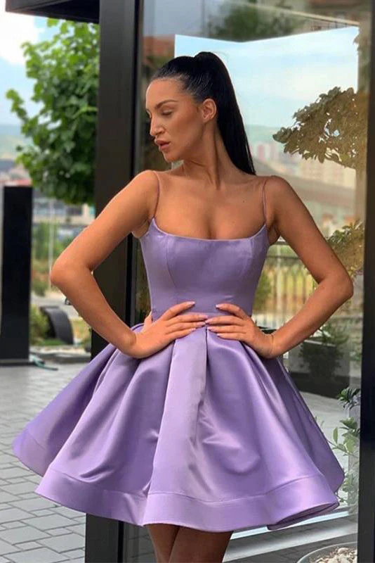 Purple A-line Satin Short Homecoming Dress Spaghetti Straps Simple Prom Dress OKX45