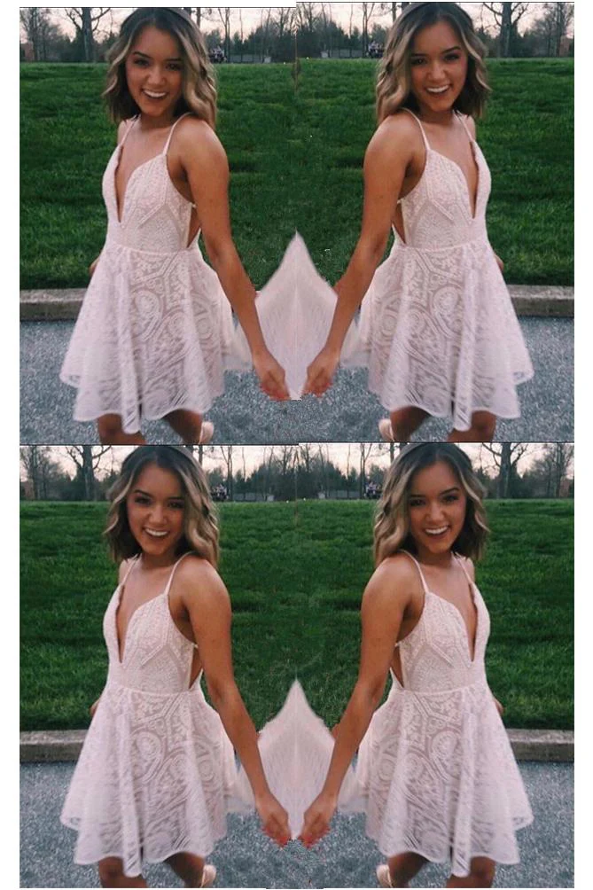 A-line Spaghetti Strap Short Graduation Prom Dress Cute Lace Homecoming Party Dress OKX80