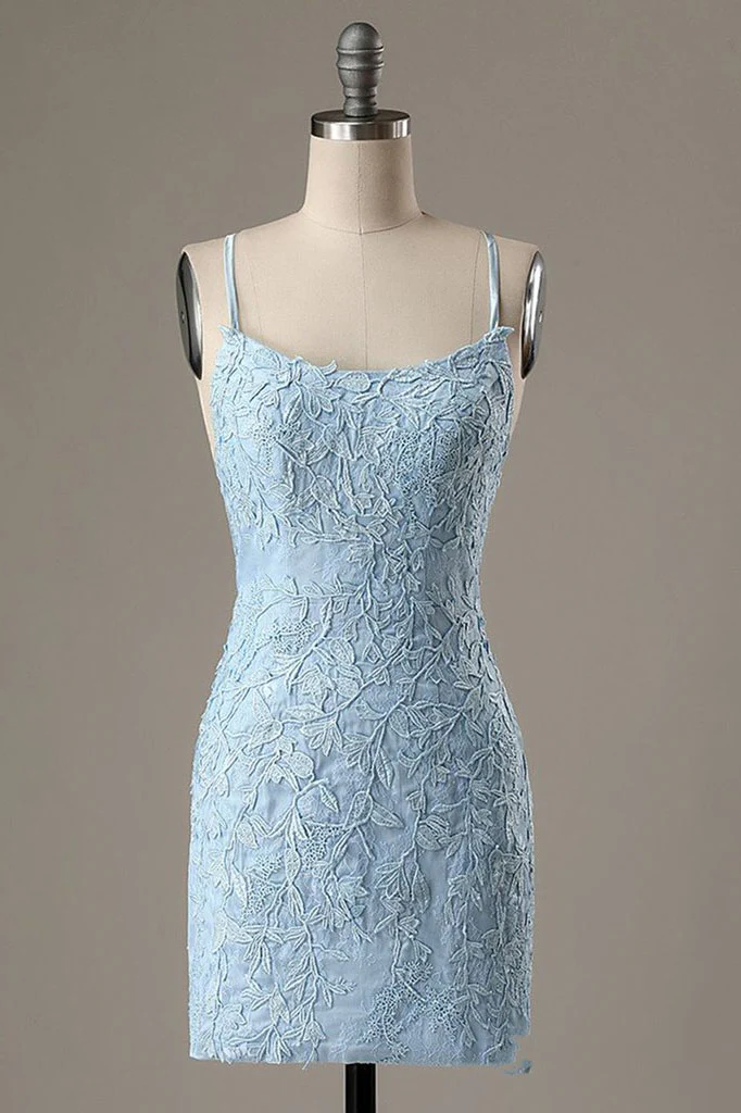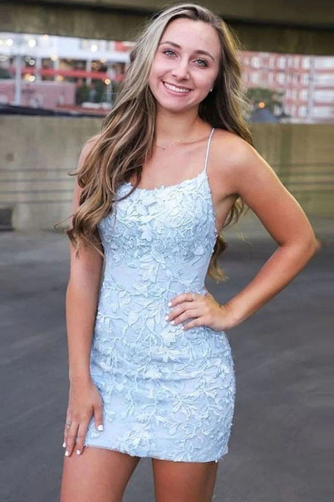 Short Light Blue Sheath Lace Prom Dresses, Tight Graduation Homecoming Dress OKX52