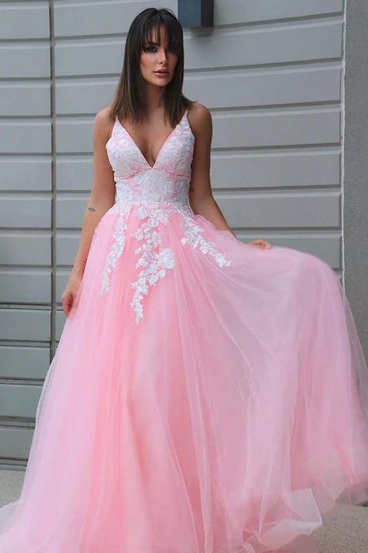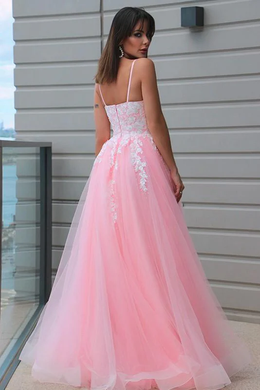 Pink A-line Tulle Spaghetti Straps Prom Dress Long Lace Appliques Formal Evening Dress OKX78