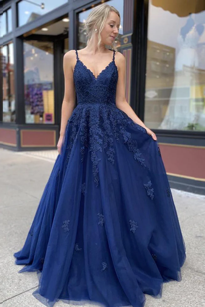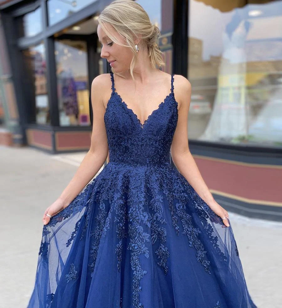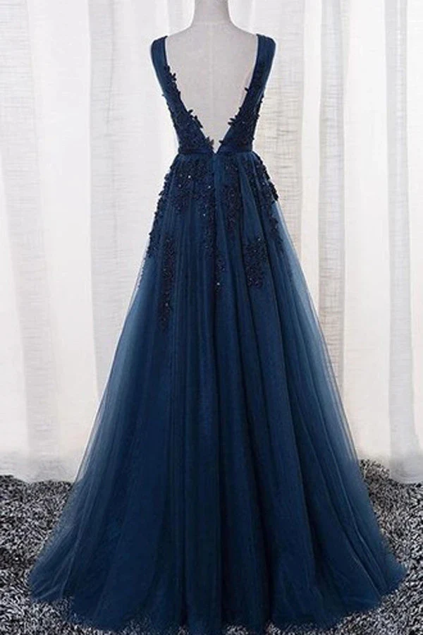 V Back Lace Appliques Navy Blue Long Prom Dress Tulle Formal Evening Dress OKX61