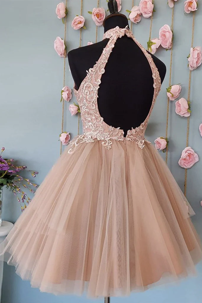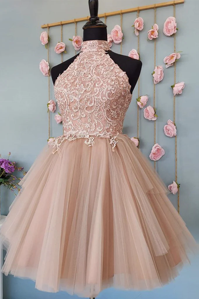 High Neck Pink Lace Top Prom Dress Short Pink Formal Homecoming Dress OKY29