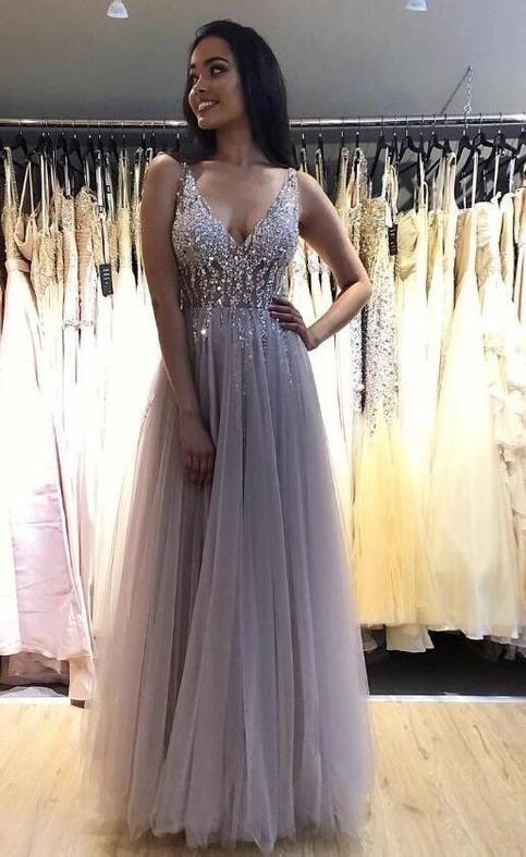 Gray Blue V Neck Tulle Beads Long Prom Dress A-line Appliques Formal Evening Dress OKY10
