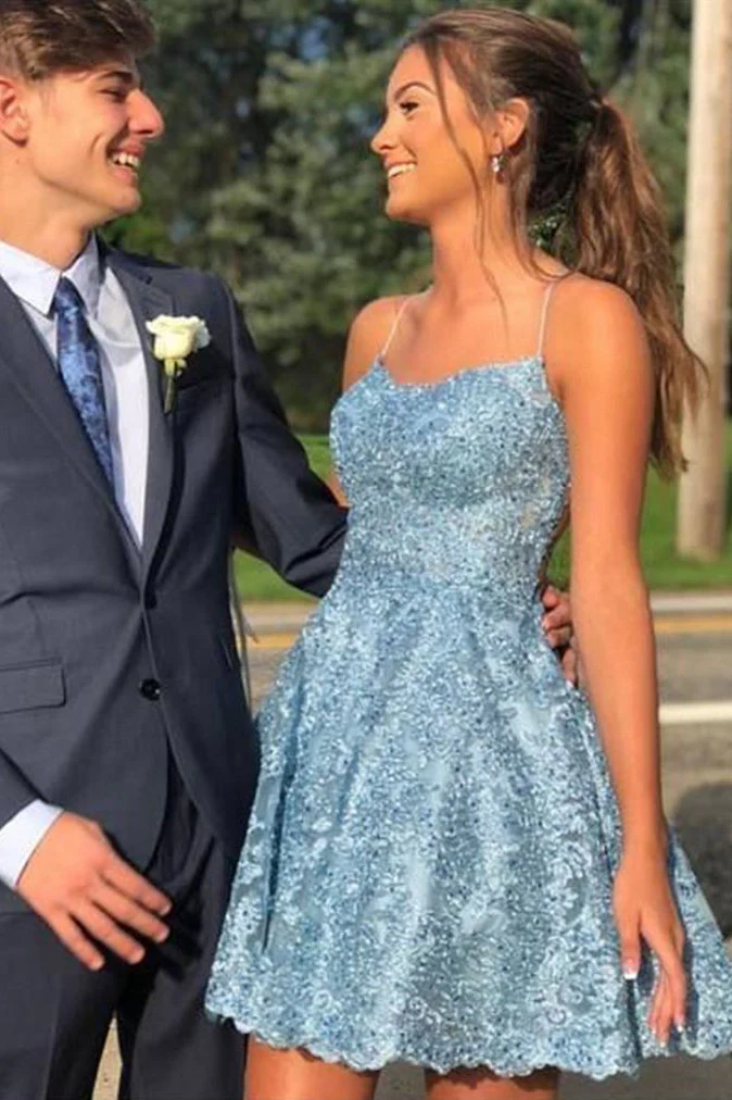 Short Blue Lace Spaghetti Straps Prom Dress Short A-line Formal Homecoming Dress OKX43