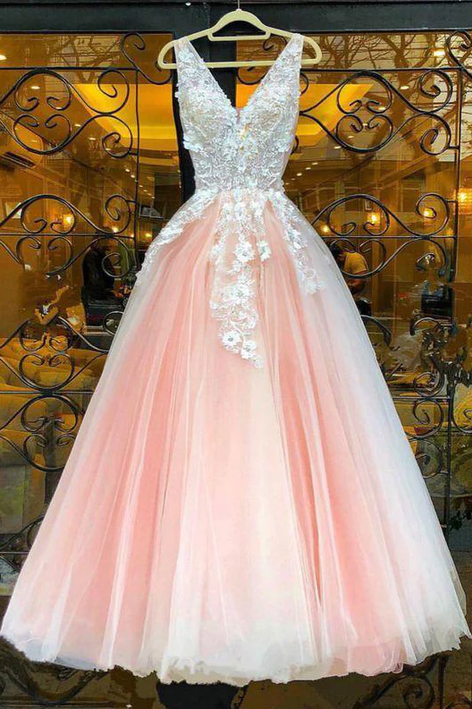 Beautiful Blush Pink V Neck Prom Dress Lace Appliques Tulle Floor Length Evening Gowns OKX60