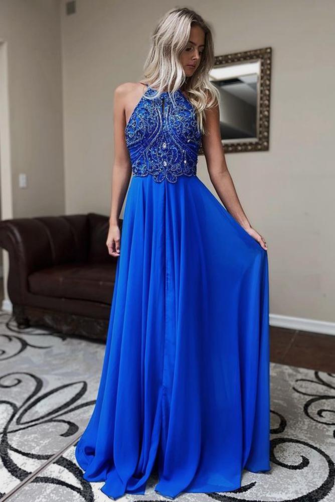Royal Blue Halter Neckline Chiffon Prom Dress A-line Beaded Evening Dress OKX74