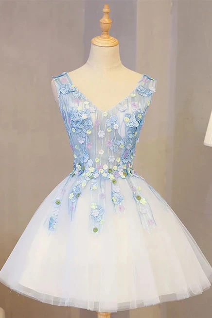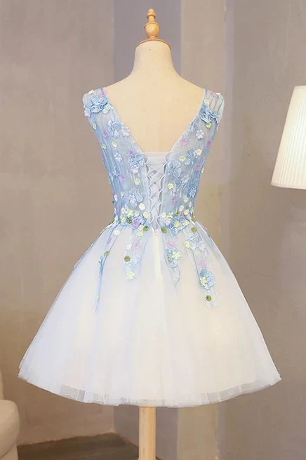Cute V Neck Lace Applique Short Prom Dress A-line Tulle Homecoming Dress OKY21