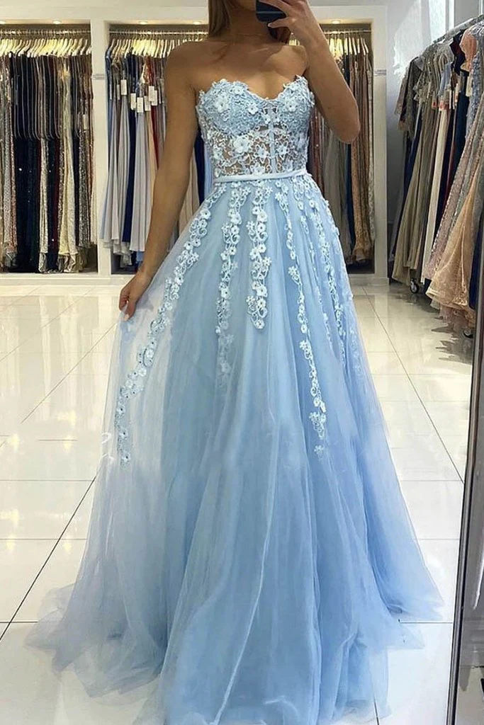 Sweetheart Light Blue Lace Appliques Tulle A-line Long Prom Dress OKY13