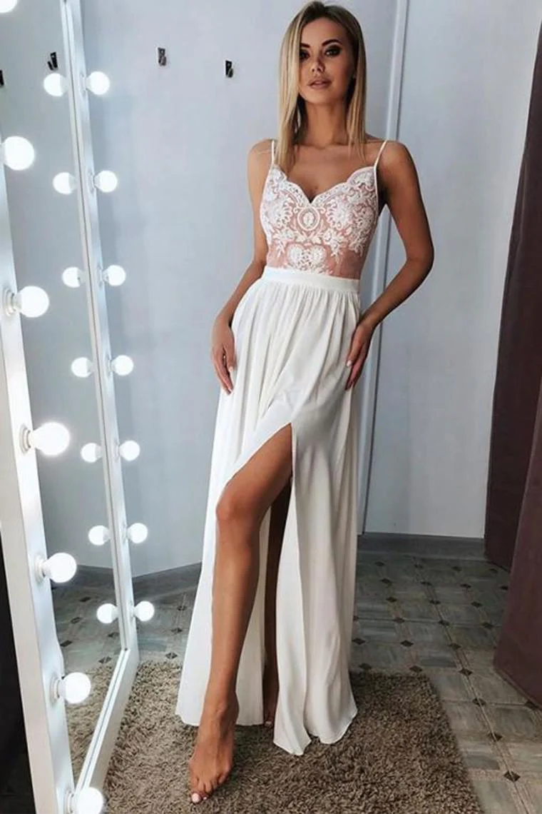 Classic A-line Spaghetti Straps Off White Split Long Prom Dress With Lace Bodice OKY38