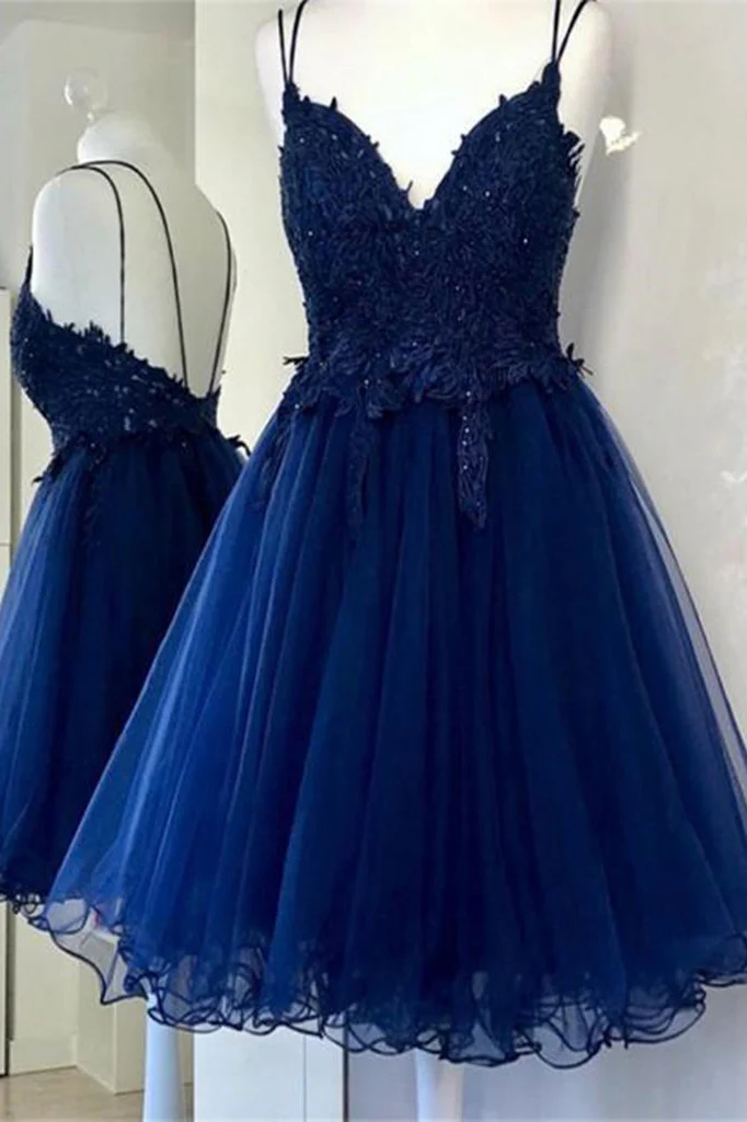 V Neck Navy Blue Lace Top Short Prom Dress Short A-line Tulle Homecoming Dress OKX65