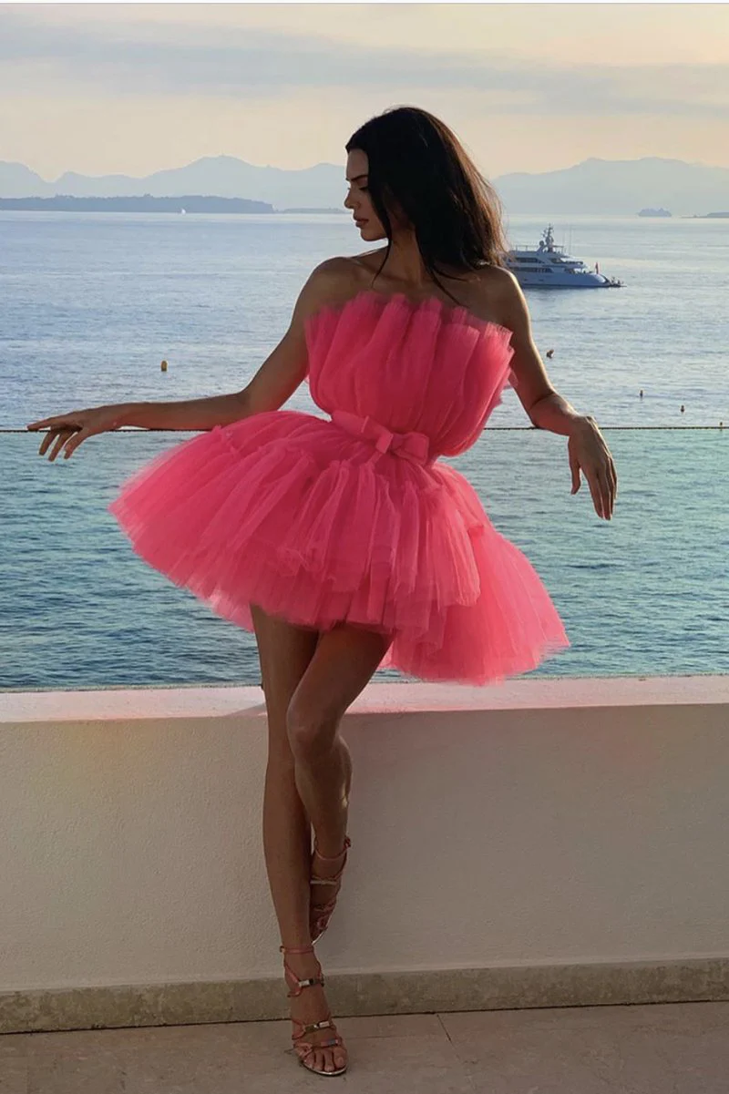 A Line Hot Pink Tulle Strapless Homecoming Dresses Short Prom Dress OKX98