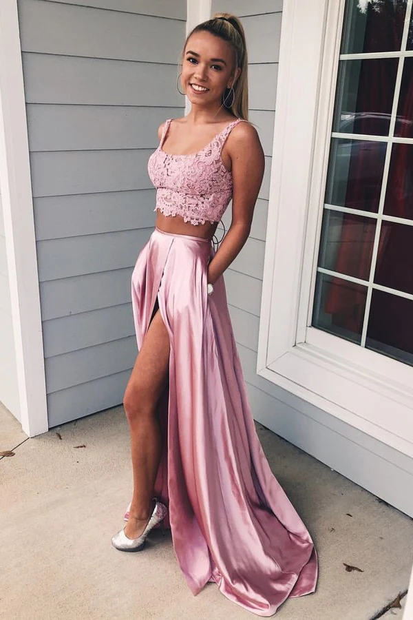 Two Piece Square A Line Pink Split Long Prom Dresses with Lace Pockets OKI72