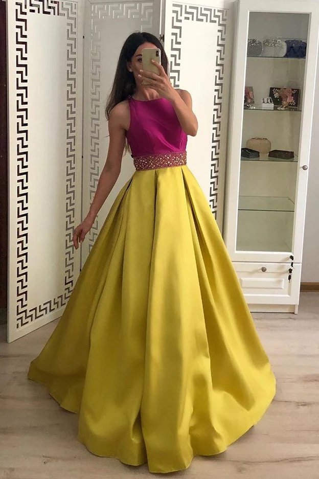Stunning A Line Satin Yellow Beaded Sleeveless Long Prom Dress OKI51