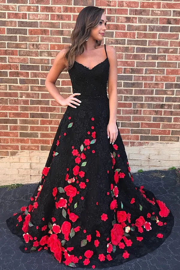 A-Line Spaghetti Straps Black Sweep Train A Line Prom Dresses with Flowers OKI74