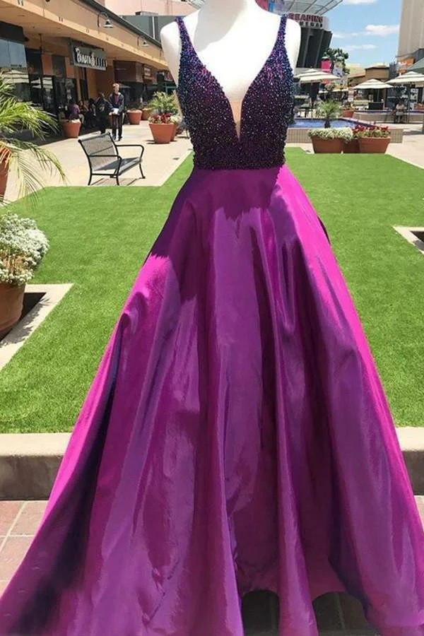 Purple A Line Beading V Neck Prom Gowns With Pockets Cheap Formal Evening Dress OKI65