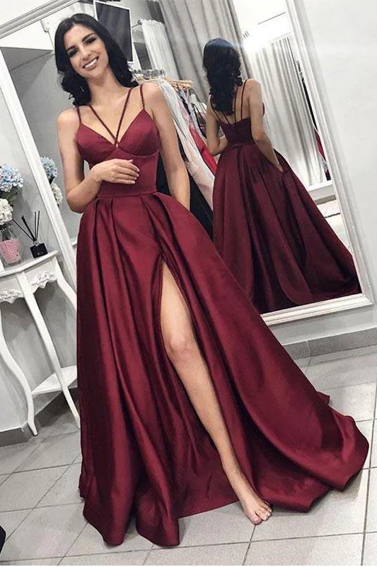 Maroon Spaghetti Straps Side Slit Long A Line Elegant Evening Prom Dress OKI58