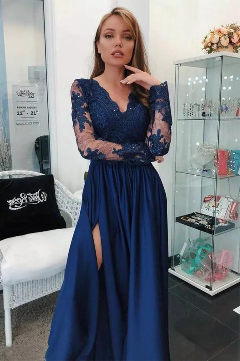 A Line Long Sleeves V Neck Dark Blue Prom Dress With Appliques OKI67