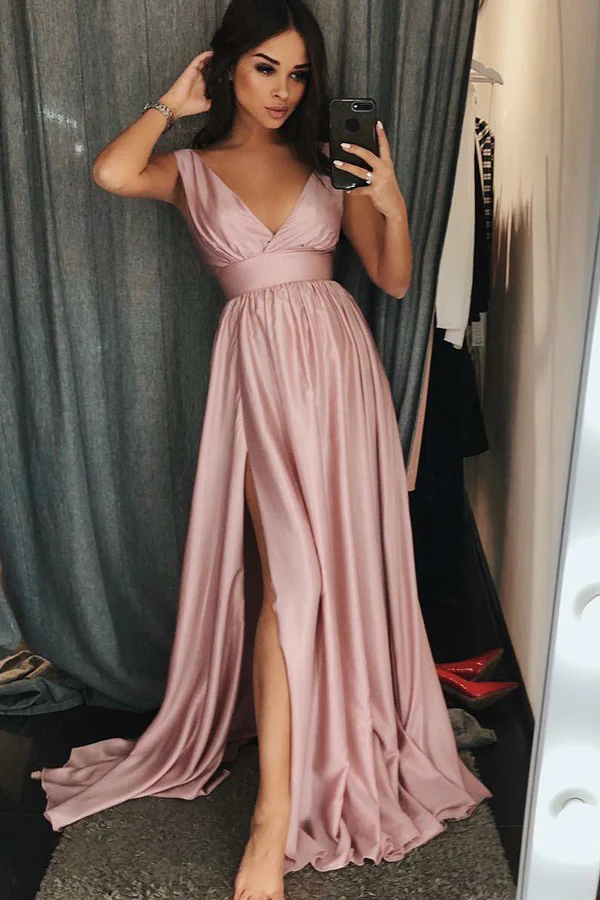 Cheap A-Line V-Neck Sweep Train Pink Prom Dresses with Pleats Split OKI92