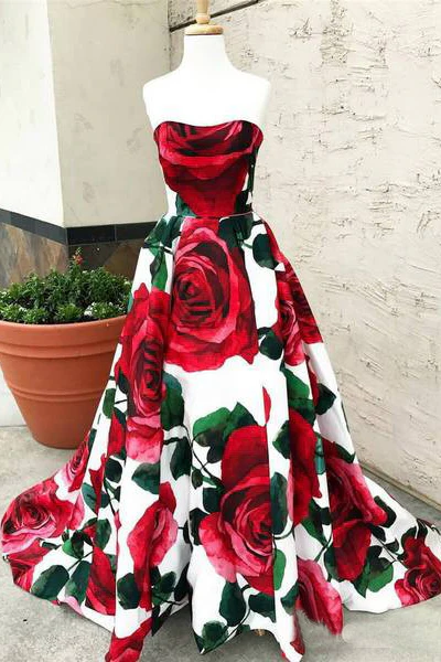 Rose Red Floral Long Prom Dress with Pockets Strapless Evening Gown OKI64