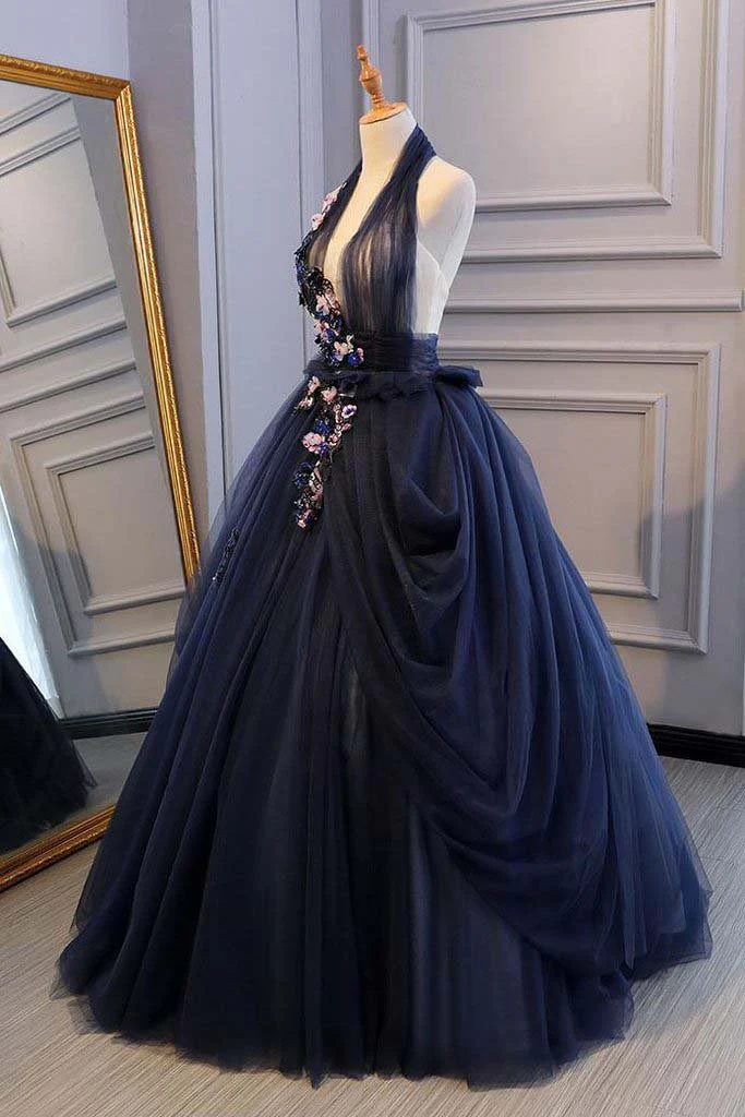Princess Ball Gown Dark Blue Tulle Halter Prom Dress Deep V Neck Backless Evening Dresses OKI90