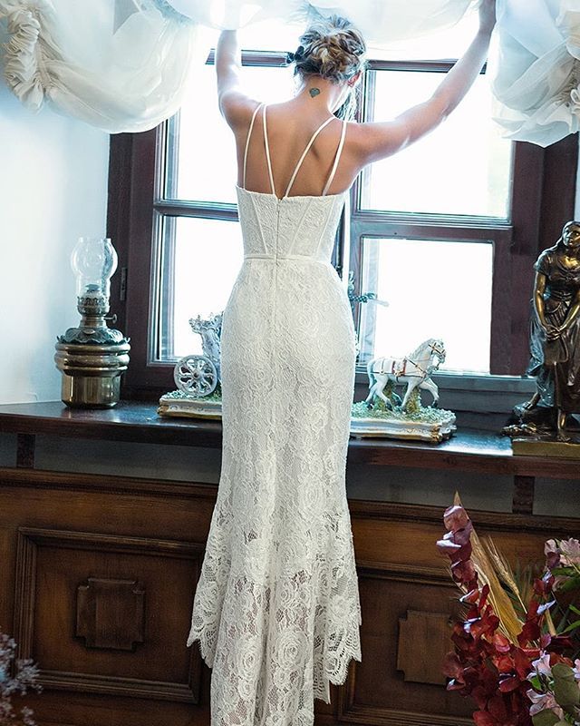 Sexy Off White Lace Mermaid Spaghetti Straps Long Prom Dresses OKP65