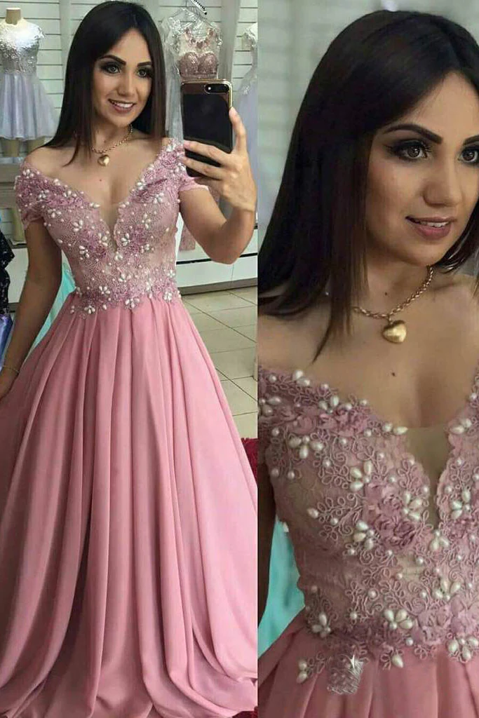 Off the Shoulder Dusty Rose Long Prom Dress Pearl Lace Formal Dress OKO98
