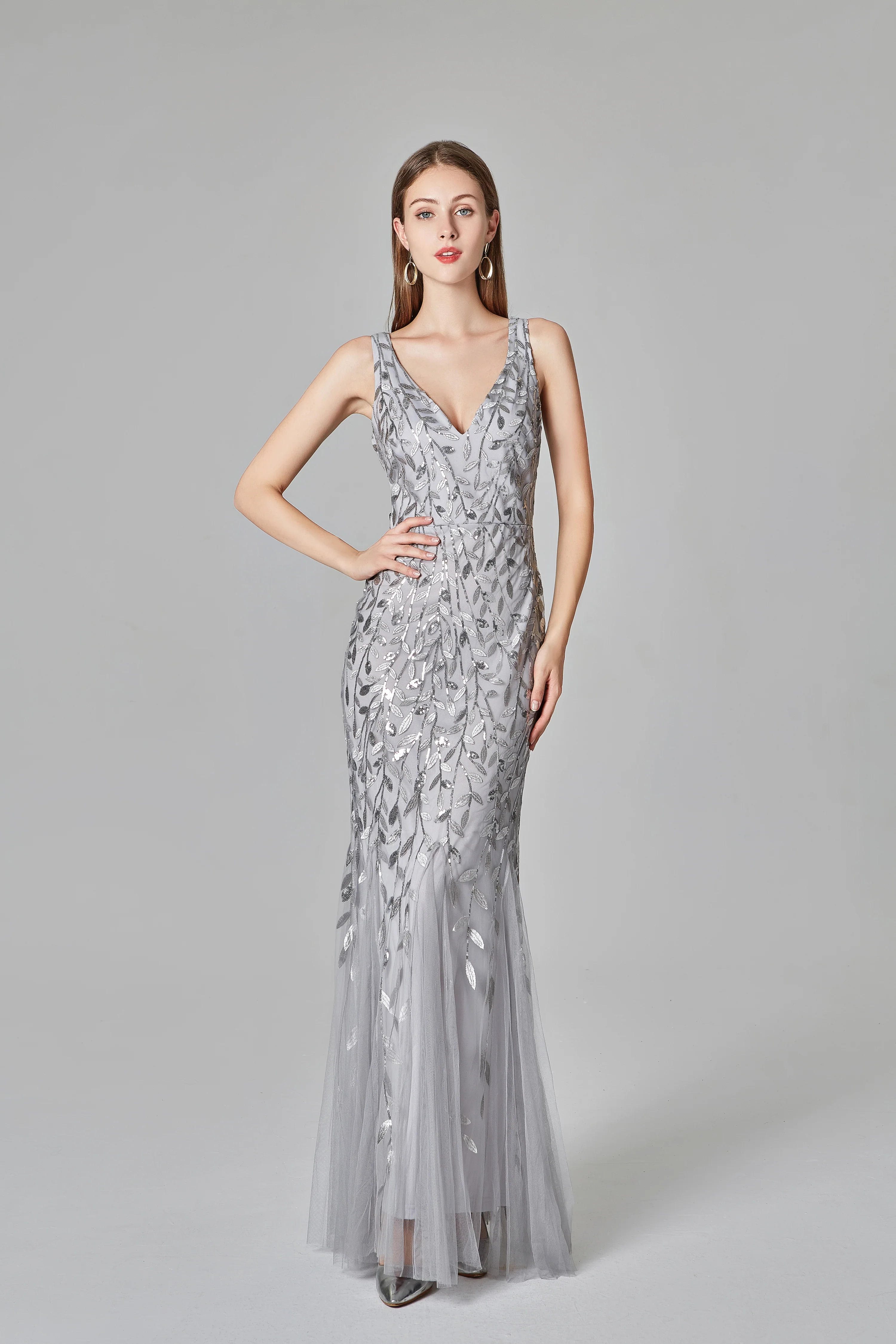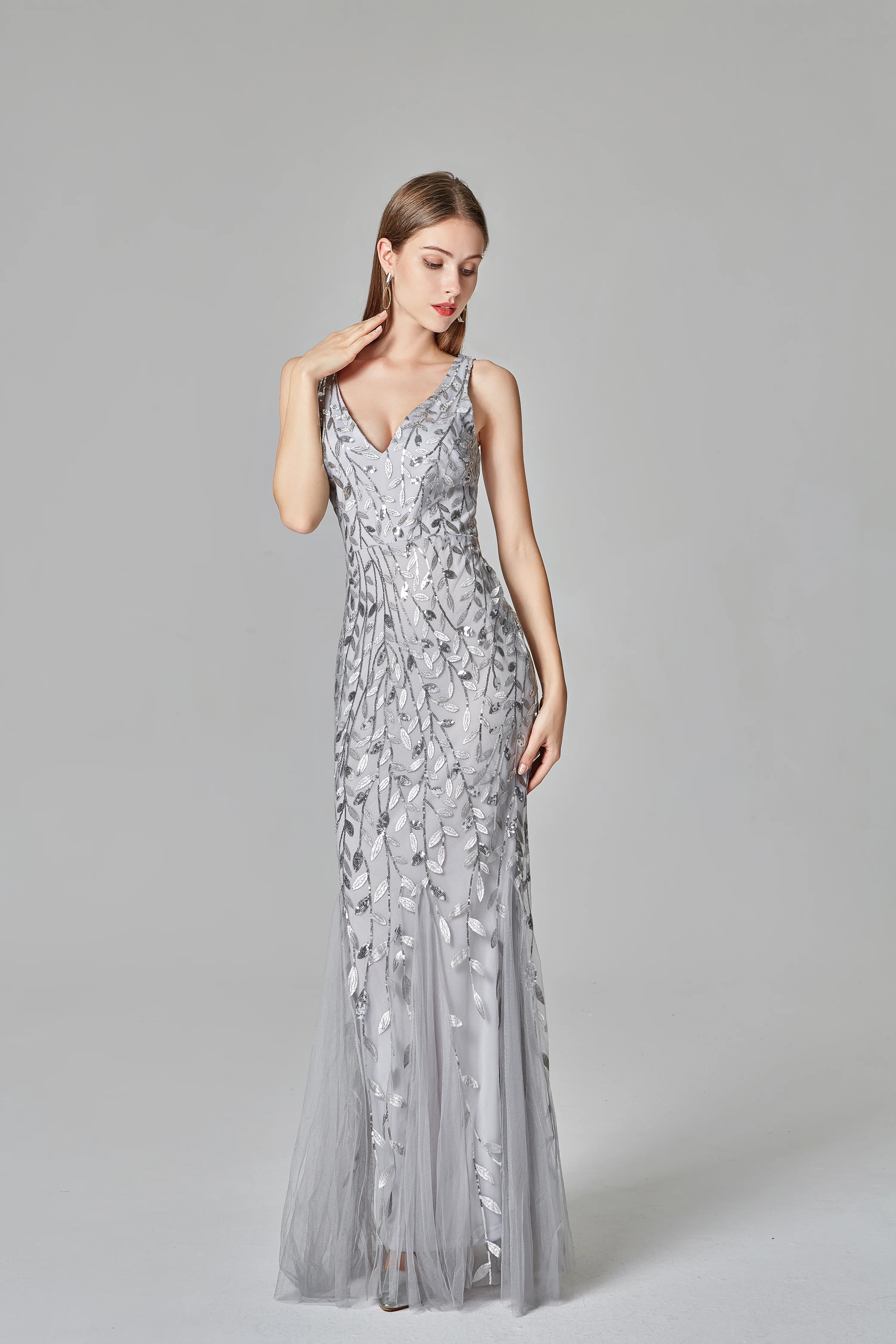 Grey Floor Length Deep V Neck Beaded Prom Dress With Lace Appliques OKO94
