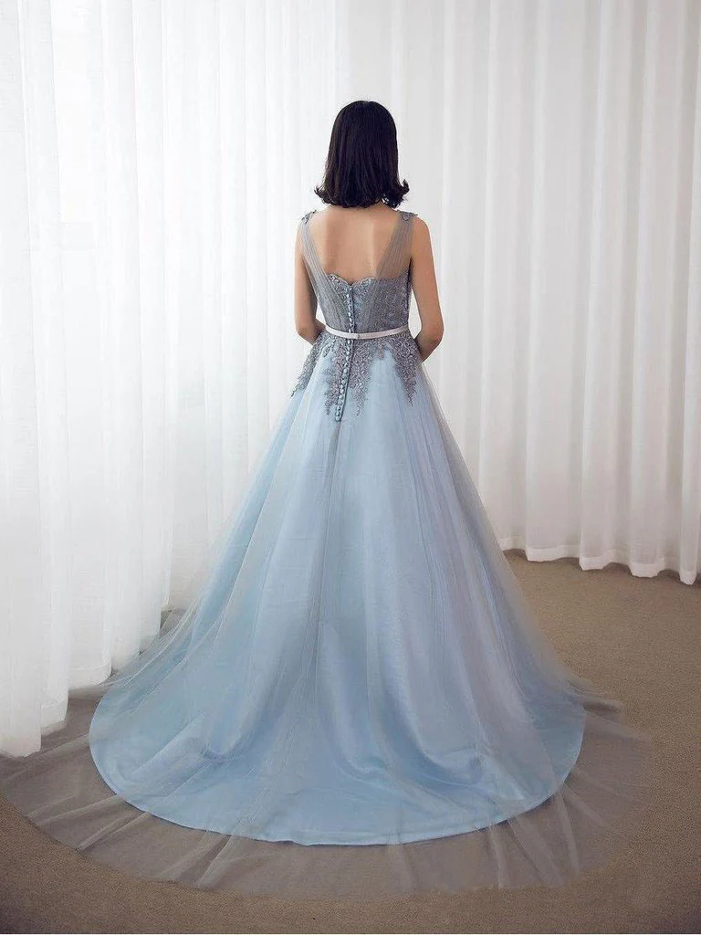 Sky Blue Formal Long Lace Appliqued Gray Tulle Prom Dress Cheap Quinceanera Dresses OKP2
