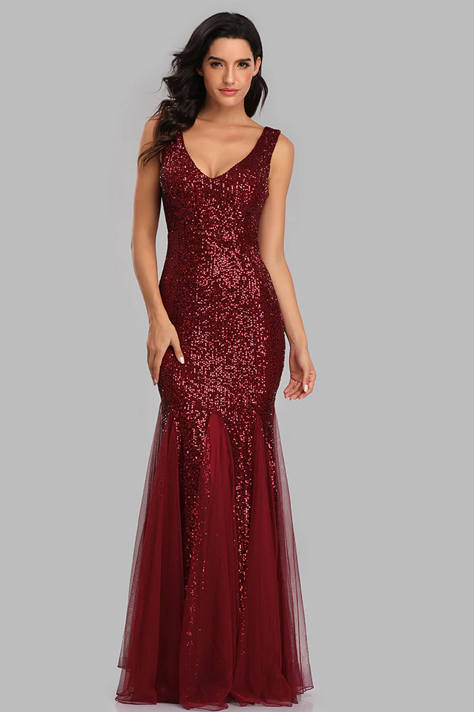 Mermaid Burgundy Tulle Long Sequined Prom Dress XU90813
