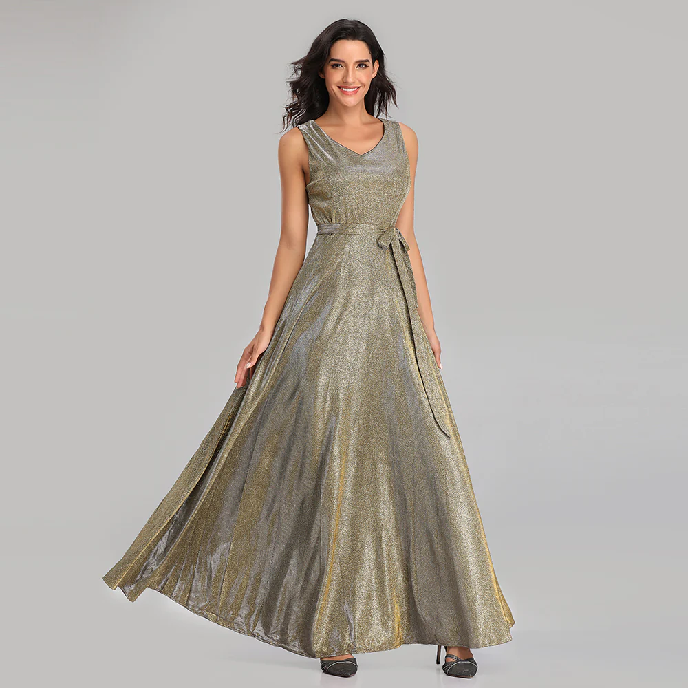 A-Line Sleeveless Silver Long Prom Dress, V Neck Sleeveless Prom Gown OKP78