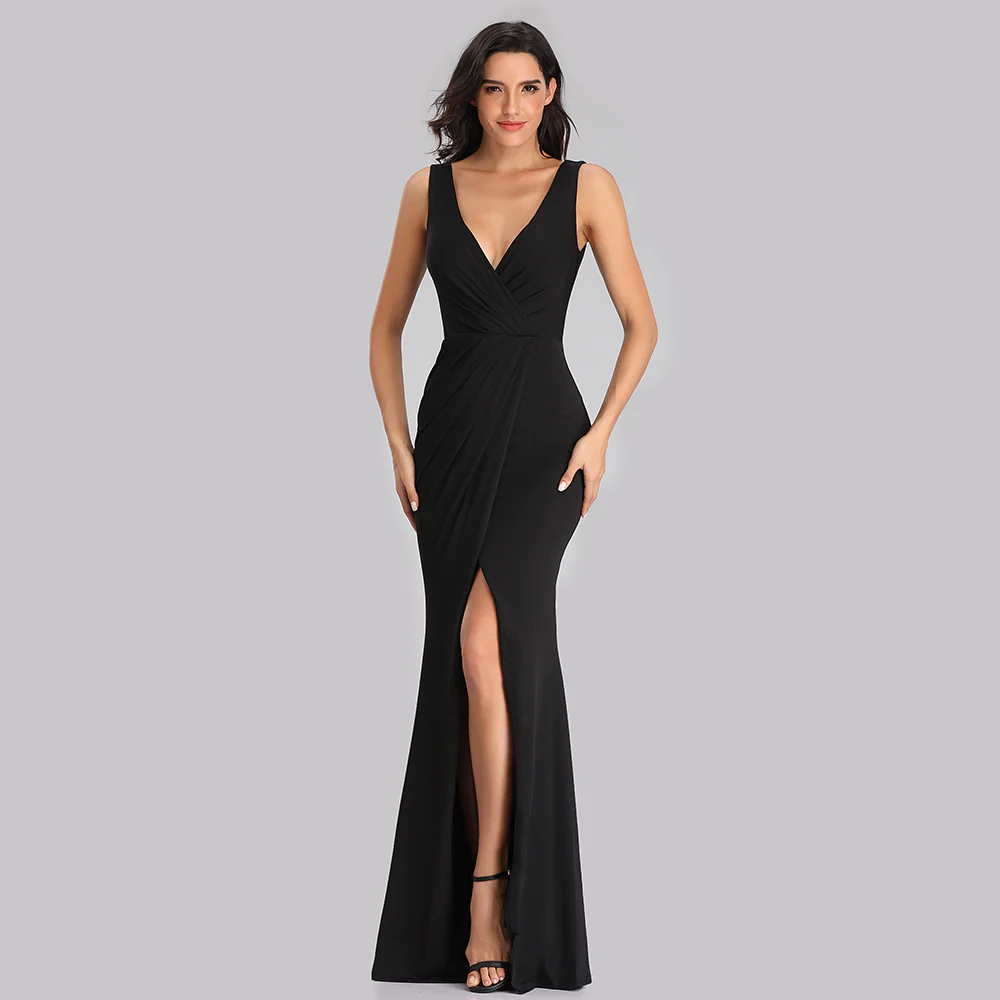 Black V Neck Long Mermaid Prom Dress With Slit XU90817