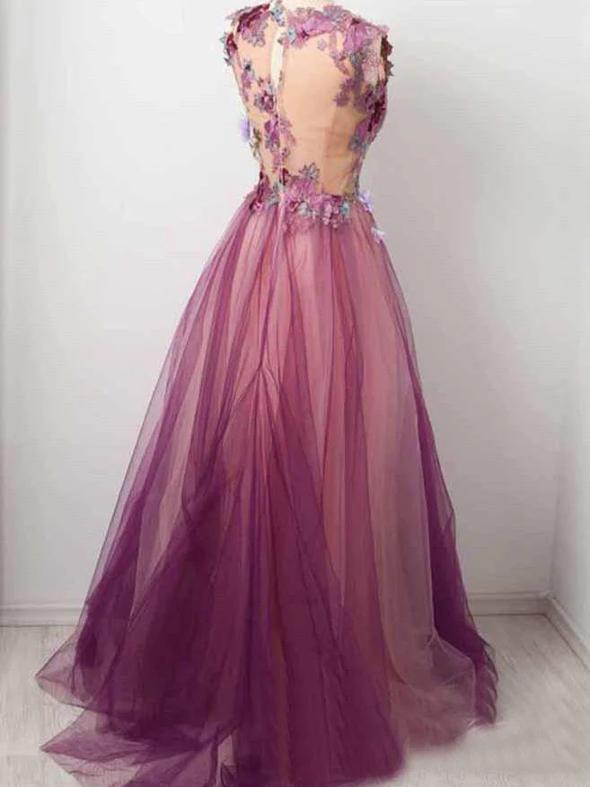 Tulle Flower A Line Prom Dress Scoop neck Appliqued Party Dress OKP15