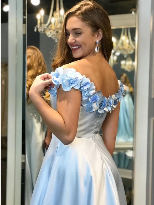 A-Line Off-the-Shoulder Light Blue Split Prom Dresses with Flowers Pockets OKP9