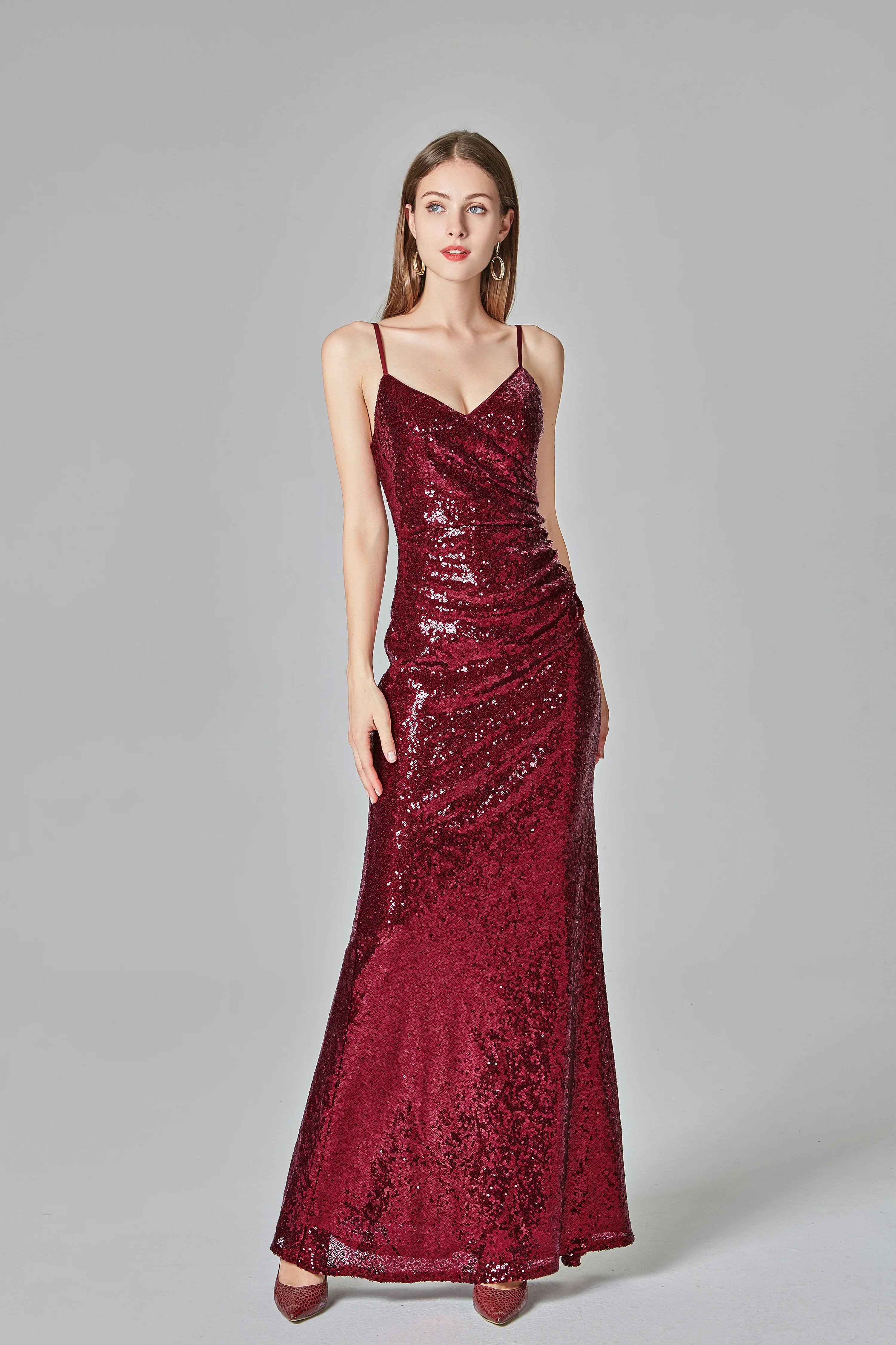 Burgundy Sequins Sheath Spaghetti Straps Prom Dress XU90811