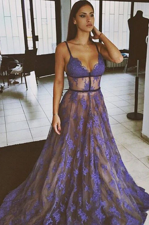 Purple Lace Spaghetti Straps Nude Lining Long Sexy Prom Dresses OK867