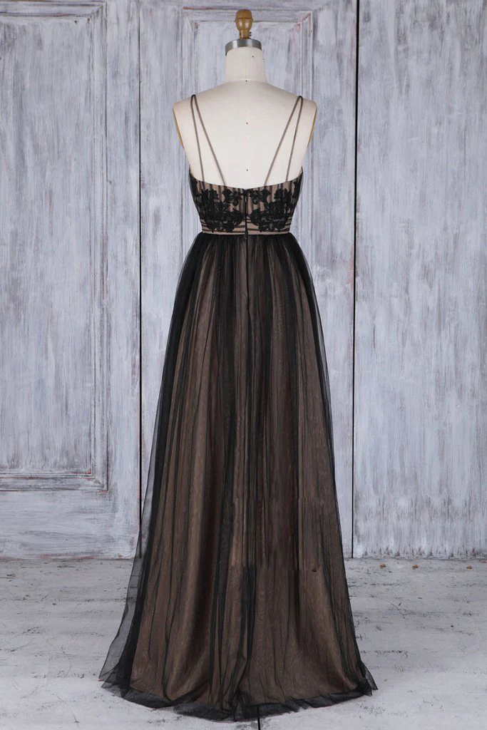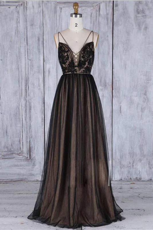 Chic Black Long Straps Tulle A Line Prom Dresses,Evening Dresses OK879