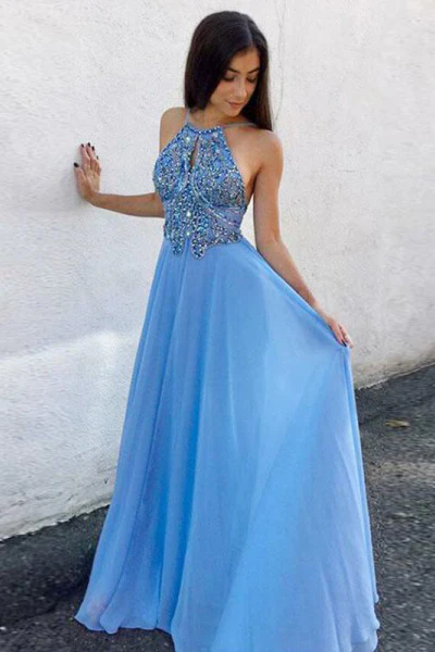 Gorgeous High Neck Halter Blue Long Chiffon Floor-Length Prom Dress OK836