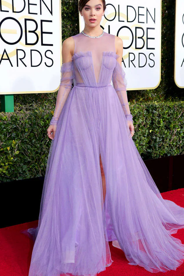 Celebrity Lilac Tulle Long Sleeves A Line See Through Prom Dresses With Slit OK854