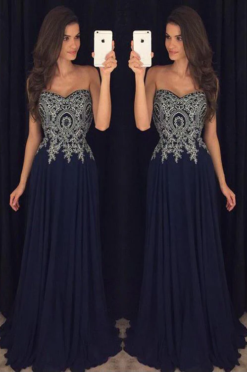 Sweetheart Navy Blue Appliques Chiffon Long Prom Gowns OK866