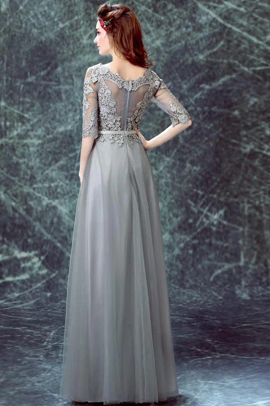 Grey Floor-length Half Sleeve Tulle Long Prom Dresses,A line Evening Dress OK882