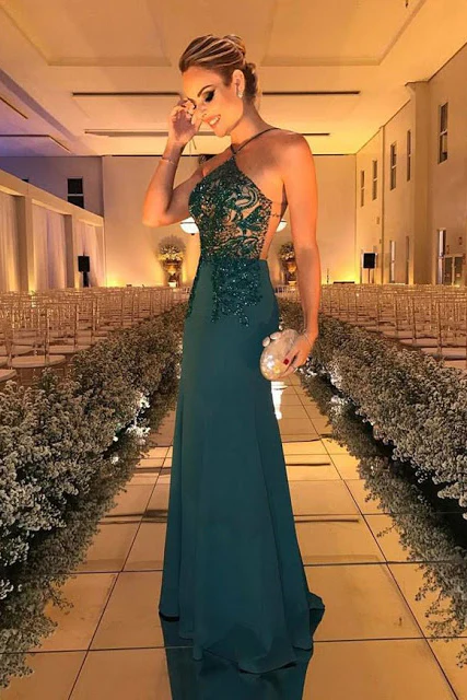 Charming Mermaid Halter Sweep Train Blue Lace Sleeveless Prom Dresses New OK830