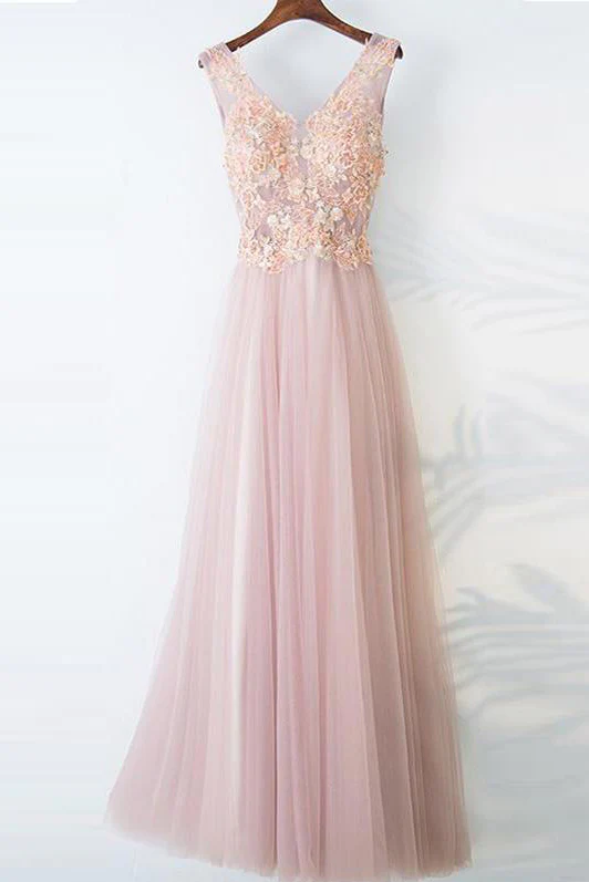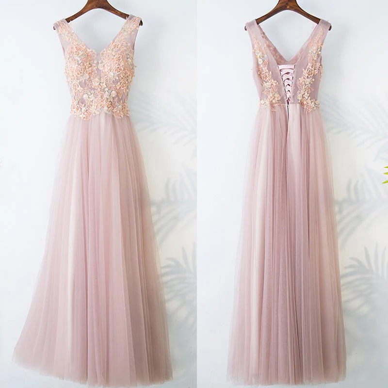 Pearl Pink Lace Top V-neck A Line Floor-length Long Tulle Beautiful Prom Dresses OK877