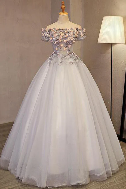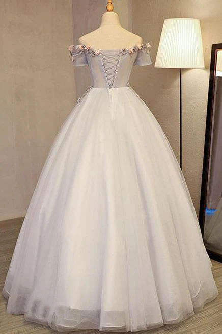 Grey Long Applique Off the Shoulder Tulle A-Line Prom Dresses OK875